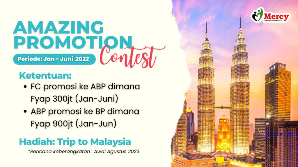 Untuk meningkatkan jumlah manpower Anda sebagai seorang leader, sehingga bisnis Anda semakin berkembang jaya dan terjadi akselerasi income, maka bagi siapapun yang memenuhi persyaratan promosi ke level ABP maupun BP, dilihat dari pencapaian Jan-Juli 2023, maka Sequis Mercy Medan akan apresiasi Anda dengan trip gratis ke Malaysia. Mari bantu lebih banyak orang mendapatkan income dengan menjadi agen Mercy. Mari bantu diri kita dan keluarga jalankan bisnis dengan lebih baik, sehingga bisa kita wariskan nantinya buat kebahagiaan keluarga tercinta