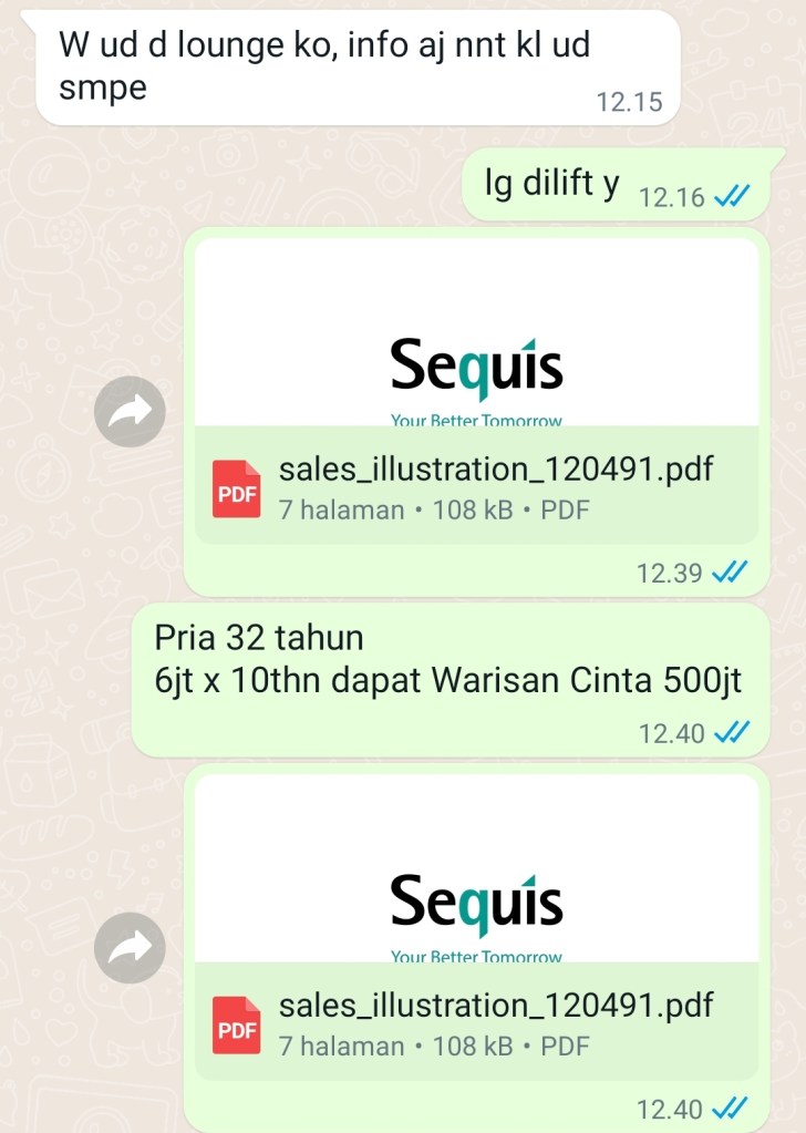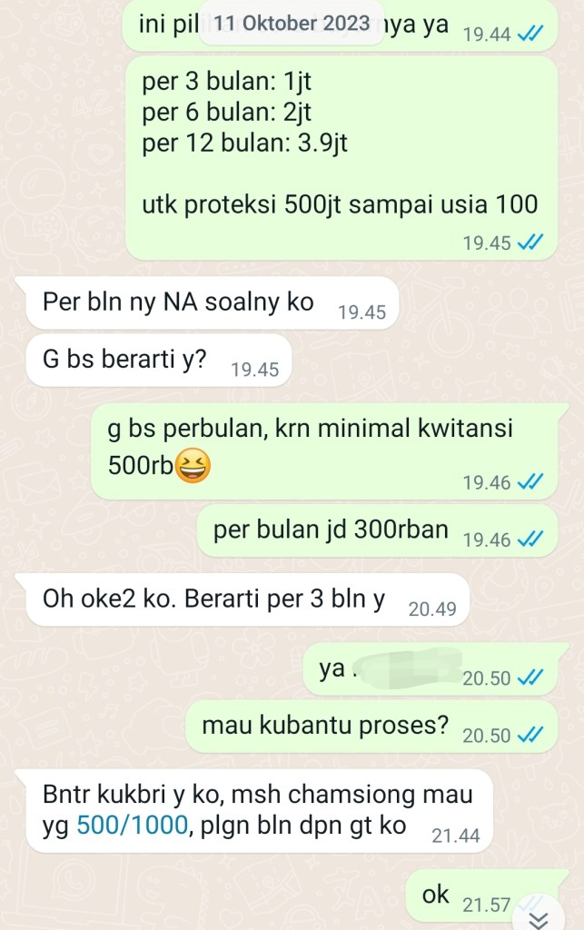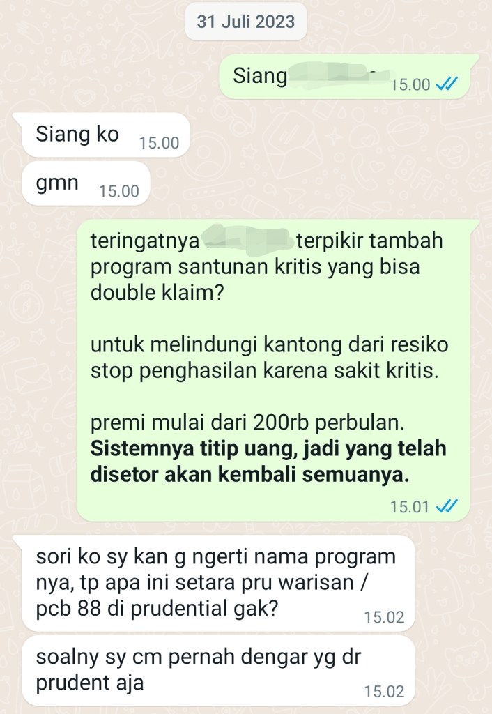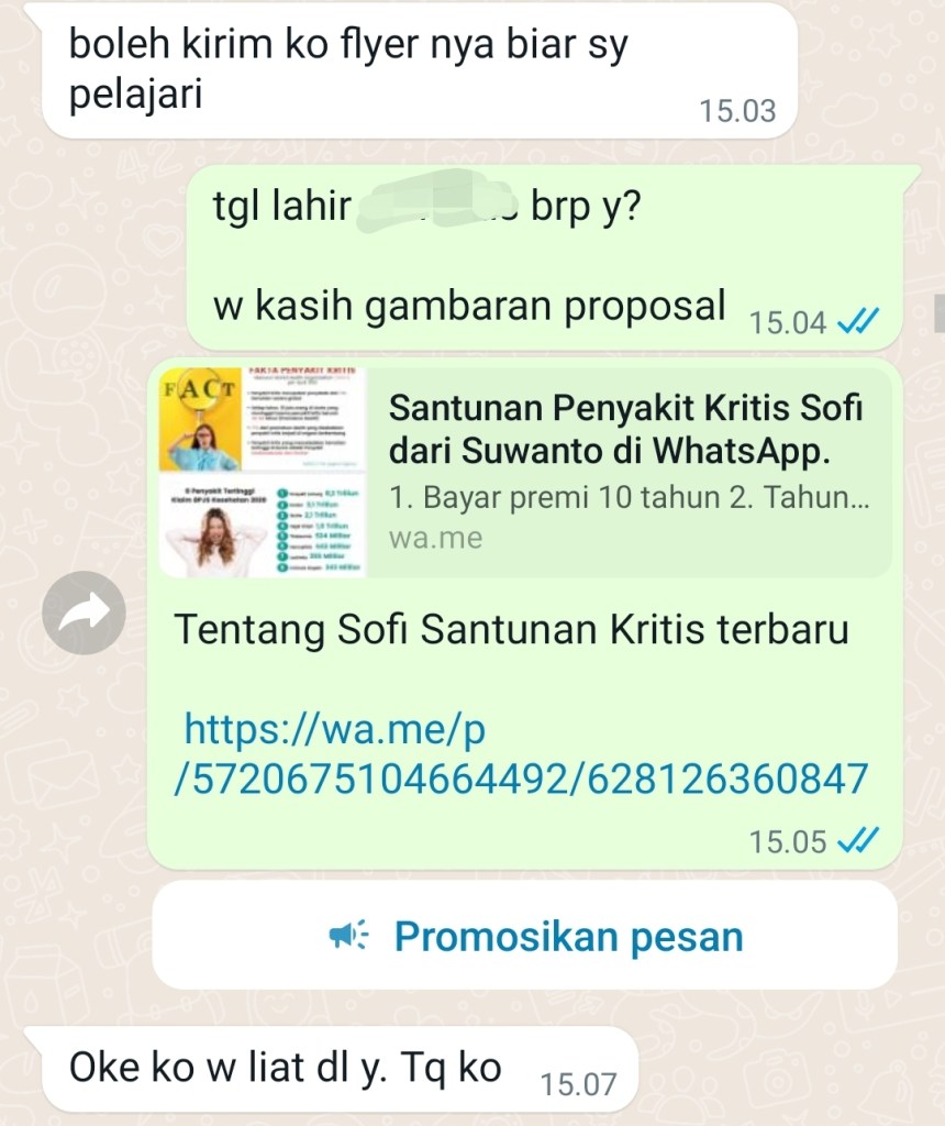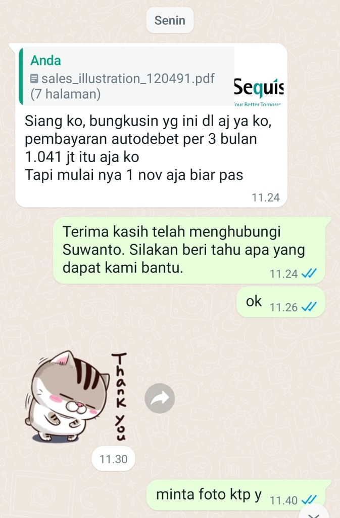 Nasabah bayar 1 November 2023pertama kali chat di whatsapp sebelumnya saling add kontak di instagram, setelah tahu nasabah mulai kerja di RS. Orangnya baik mau isi form survey.mulai kontak poin dengan ajak ke dinner sequis, belum bisa karena ternyata nasabah kerja sampai jam 8 malammulai pendekatan dengan konsep santunan kritiscalon nasabah tertarik mau lihatsaat jumpa nasabah cerita sudah pernah masuk Prucinta bayar 10 tahun proteksi 20 tahun. Namun nasabah kecewa karena proteksi tidak seumur hidup.sampaikan promo pensiunajak jumpa karena respon baikakhirnya jumpasaat jumpa lakukan fact finding dan presentasi sesuai kebutuhanlagi diskusiakhirnya deal