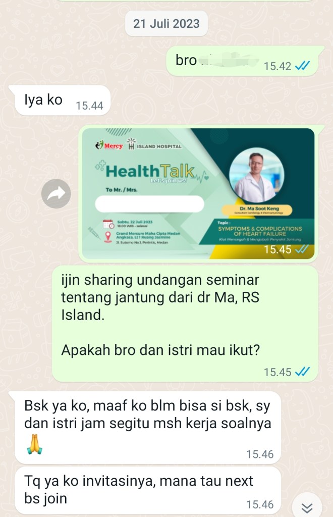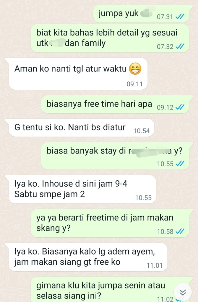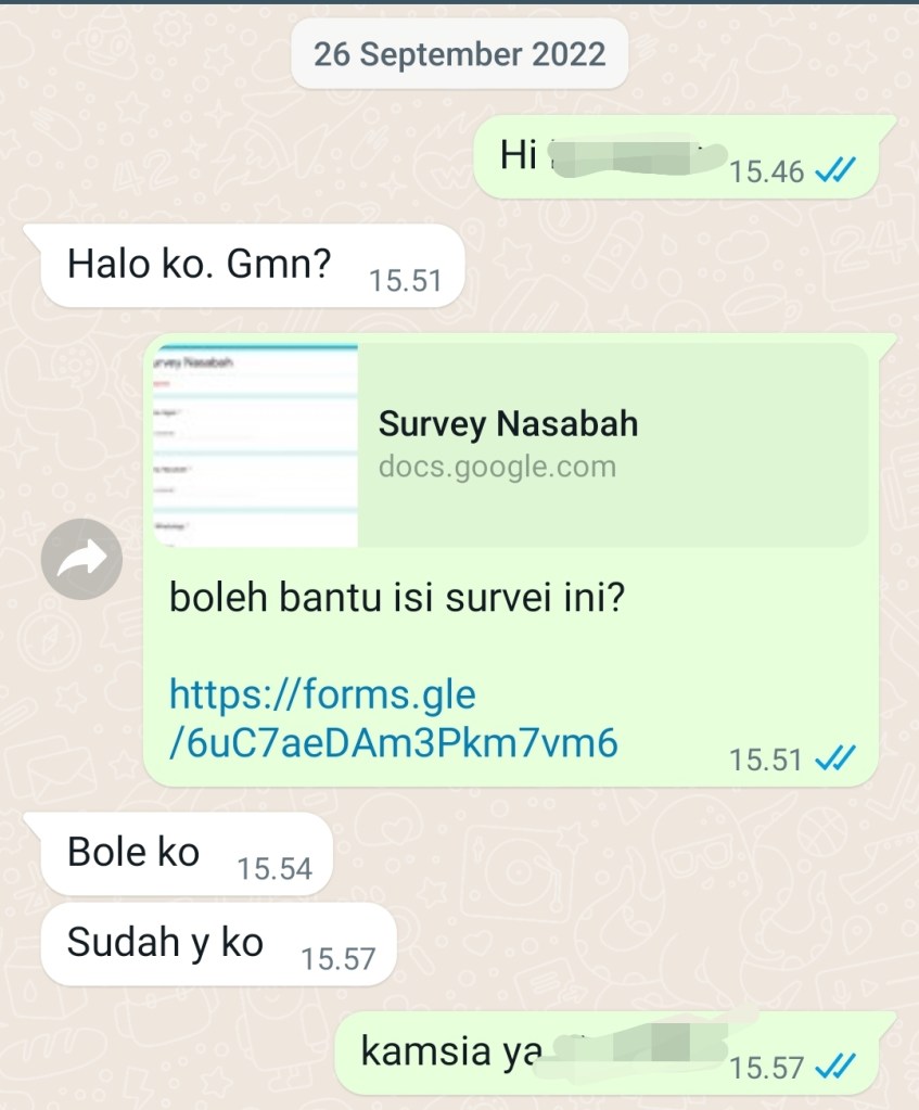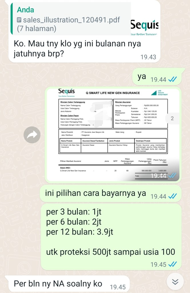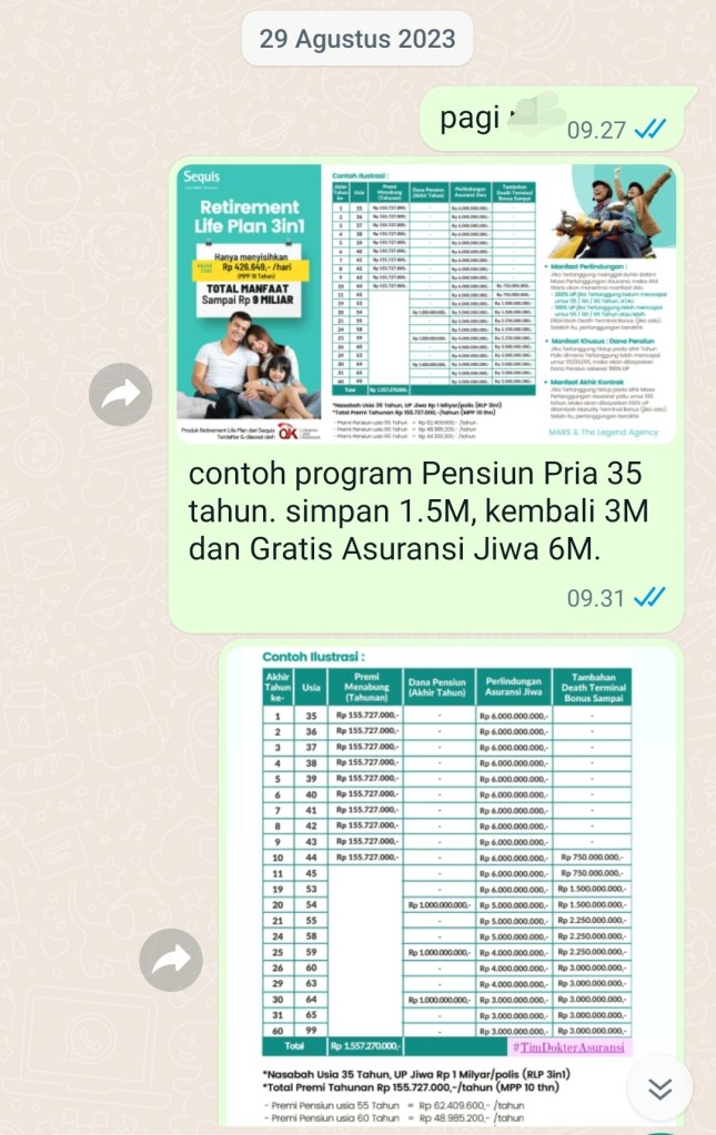 Nasabah bayar 1 November 2023pertama kali chat di whatsapp sebelumnya saling add kontak di instagram, setelah tahu nasabah mulai kerja di RS. Orangnya baik mau isi form survey.mulai kontak poin dengan ajak ke dinner sequis, belum bisa karena ternyata nasabah kerja sampai jam 8 malammulai pendekatan dengan konsep santunan kritiscalon nasabah tertarik mau lihatsaat jumpa nasabah cerita sudah pernah masuk Prucinta bayar 10 tahun proteksi 20 tahun. Namun nasabah kecewa karena proteksi tidak seumur hidup.sampaikan promo pensiunajak jumpa karena respon baikakhirnya jumpasaat jumpa lakukan fact finding dan presentasi sesuai kebutuhanlagi diskusiakhirnya deal